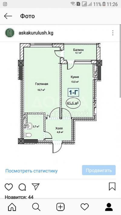 Продаю 1-комнатную квартиру, 45,6кв. м., этаж - 4/9, Баха/Гагарина..