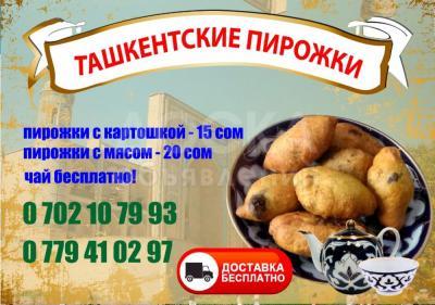 Ташкентские пирожки. Пирожки с картошкой - 15 сом Пирожки с мясом - 20 сом Чай бесплатно. Доставка бесплатно.
