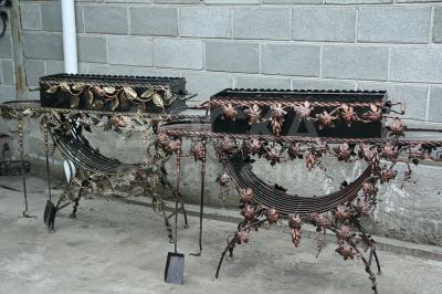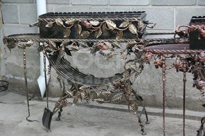 Подставка для цветов на 6-ть больших горшков без ковки 3800 сом. Такая же но украшена вьющейся розой 6000 сом, веера что расположенные по сторонам на стене на 4 горшка отдам по 3000 сом, в середина вьющиеся виноград на один горшок отдам за 1800 сом, мангалы по 18 тысяч сом.