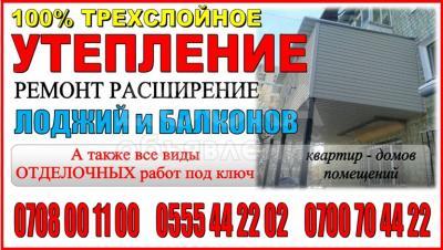 100% Трехслойное утепление, ремонт, расширение лоджий, балконов, квартир, контейнеров и жилых промышленных зданий. А также Ремонт и все виды отделочных работ квартир и офисов под ключ. Быстро и качественно! Тел.: 0708 001100; 0555 442202