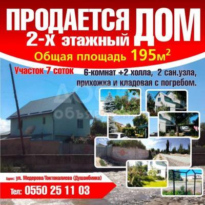 Продаю дом 6-комнатную 195кв. м., этаж-2, 7-сот., стена другое, ул. Медерова / Токтоналиева (Душанбинка).