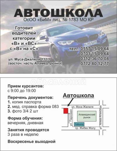 Автошкола БиМ! Новый набор категории В и ВС, с категории В на С. мы находимся по адресу: ул.Мусы Джалиля 132/1 (восточная часть Аламединского рынка) т. 0557150964, 0772801277, 0312367008
