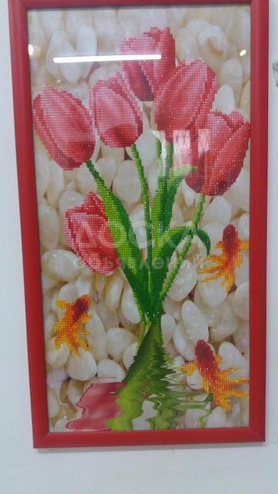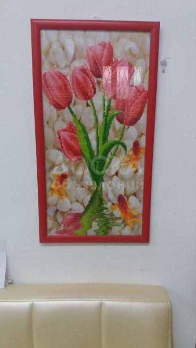 "Тюльпаны" - оконченная картина 5Д из разноцветных стразов. Декор стены, комнаты, кабинета, офиса. Отличный подарок. Размер: 32х57 см. в рамке.