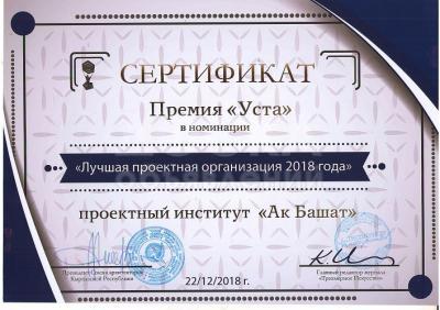 В 2018 году Проектный институт «Ак-Башат» был удостоен премии «Уста» в номинации «Лучшая проектная организация 2018 года», – престижной национальной премии Кыргызской Республики в области архитектуры, строительства, живописи и дизайна.