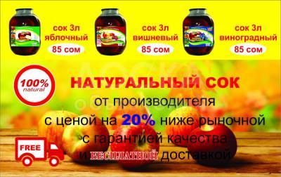 1 литр - 25 сом. Яблочный,абрикосовый,вишневый и виноградный. Принимаем заказы на банкеты и тои, от 200 л доставка по городу БЕСПЛАТНО!!!