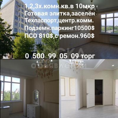 Продаю 1,2,3х.комн.кв.в готовой элитке.10мкр.,заселён,техпаспорт.ПСО 820$.С ремонтом 960$.Подземный паркинг 10500$
