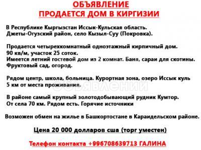 Продаю дом 4-ком. 90кв. м., этаж-1, 25-сот., стена кирпич, Джеты-Огузский район село Кызыл-Суу (Покровка).
