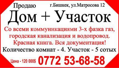 Продаю дом 4-ком. 72кв. м., этаж-1, 5-сот., стена саман, г.Бишкек, ул.Матросова 12.