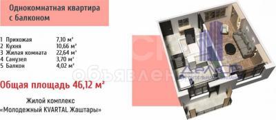 Продаю 1-комнатную квартиру, 44кв. м., этаж - 3/9, Юж. Магистраль-пр. Ч. Айтматова.